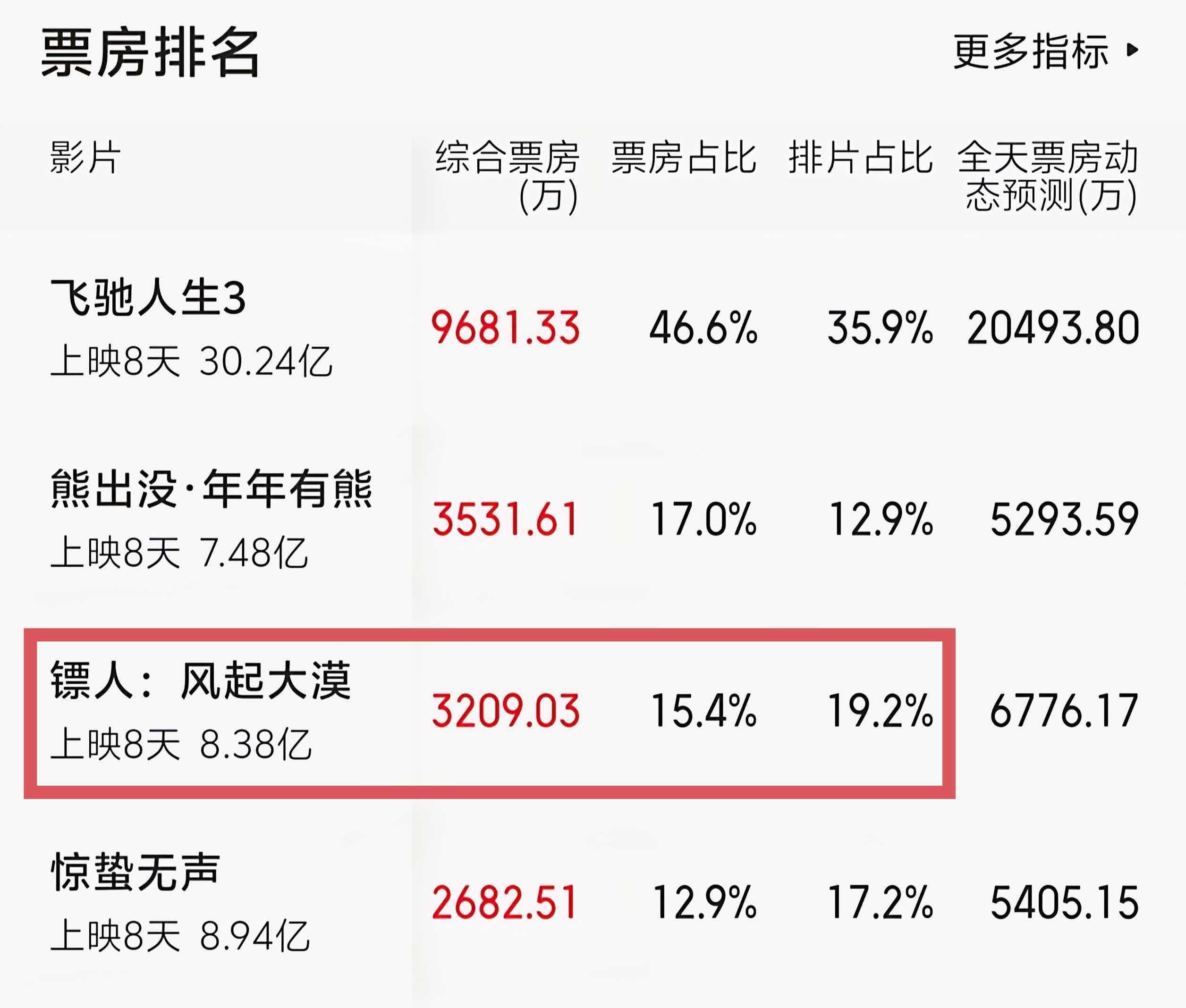 好在排片量上,“镖人”仍是仅次于《飞驰人生3》,只要能一直保持这个状态不变,总票房还是有机会达到专业预测的13亿。
