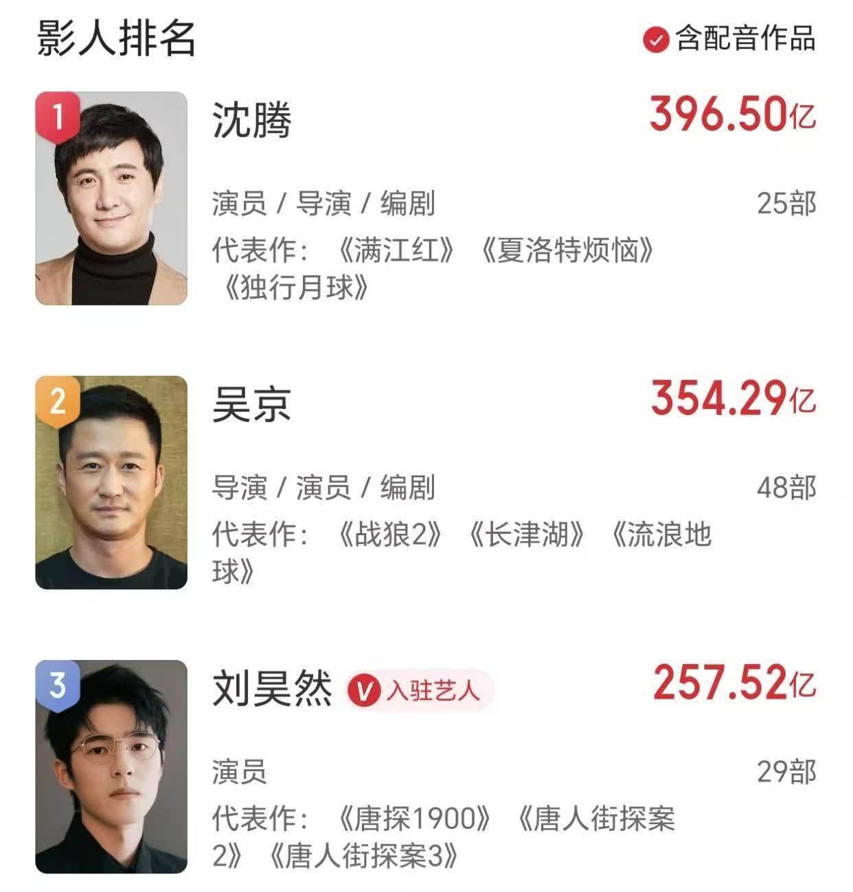 前些年,中国演员票房榜首在沈腾和吴京之间交替。